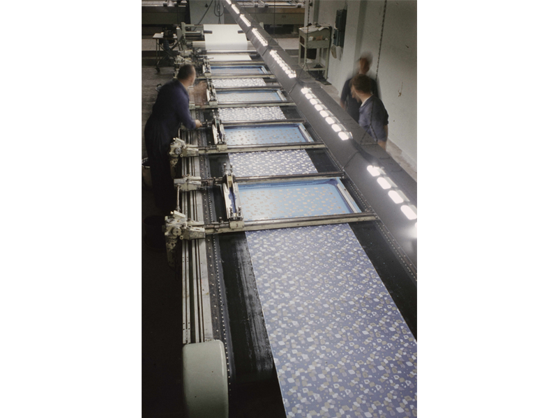 Het bedrukken van (Ploeg)stoffen, C. 1960-1980. Weverij De Ploeg bedrukte de stoffen niet zelf maar besteedde dat uit (bron: TextielMuseum Tilburg)